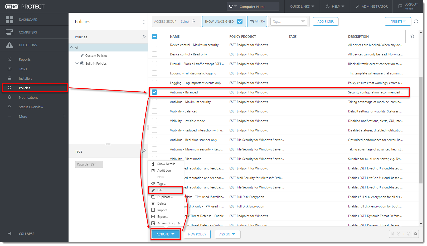 Edit the policy selected in step 2 and click the toggle next to Enable Ransomware Shield Audit mode to disable it and ensure the automatic ransomware protection of the managed computer.