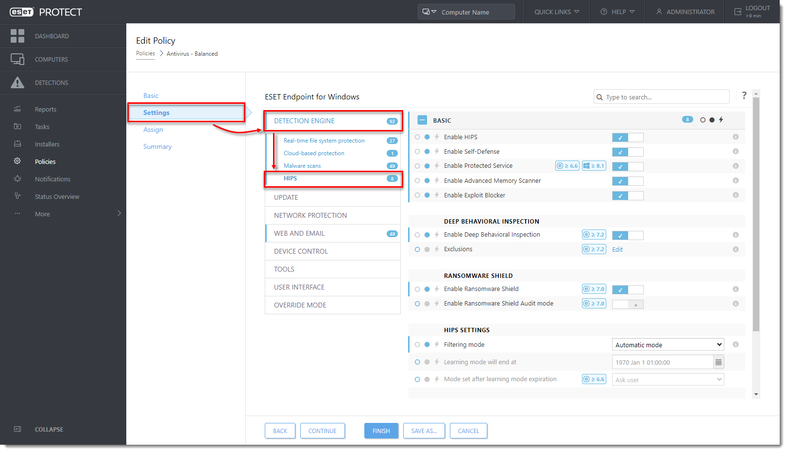 Click Settings → Detection Engine → HIPS.