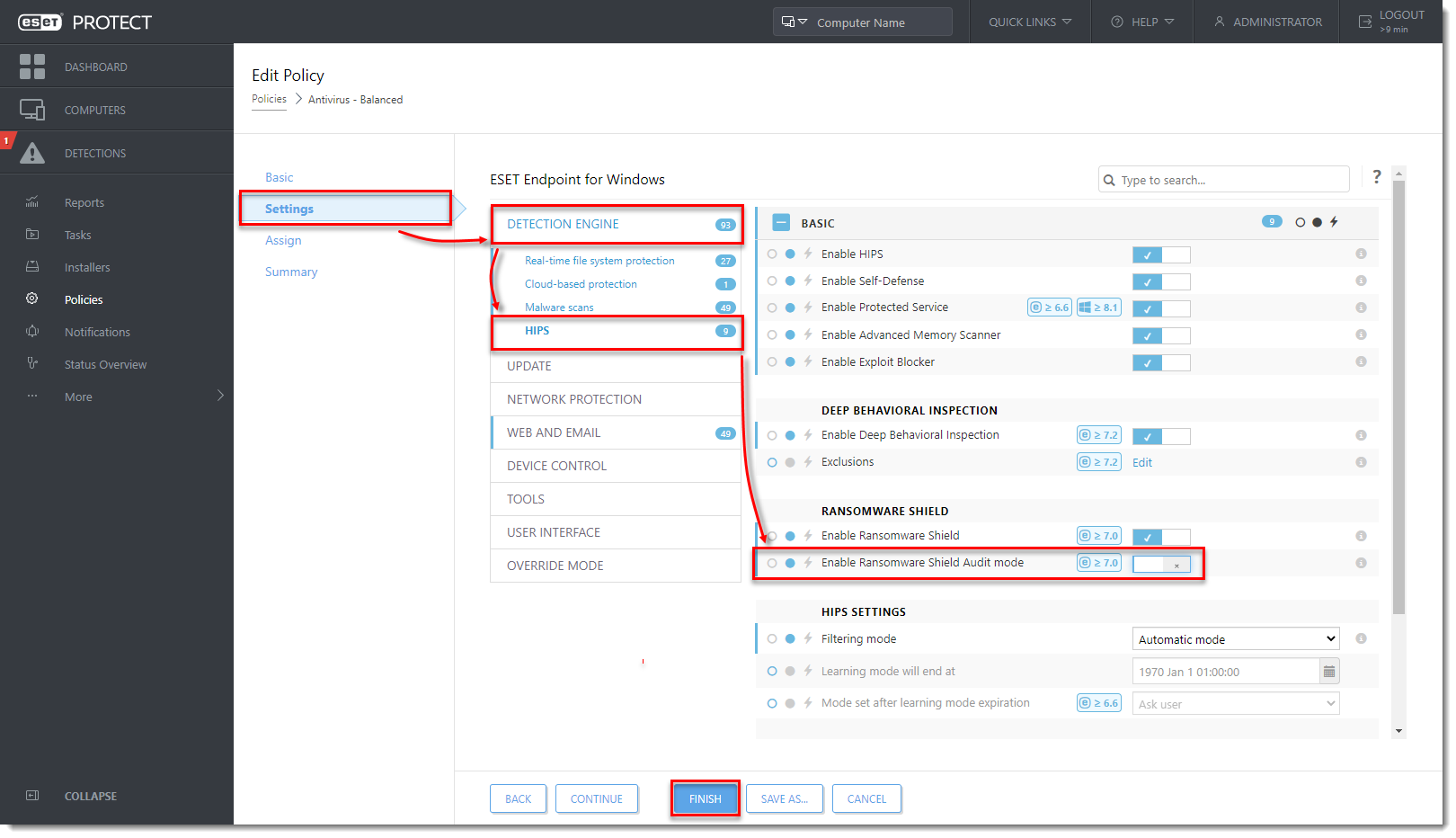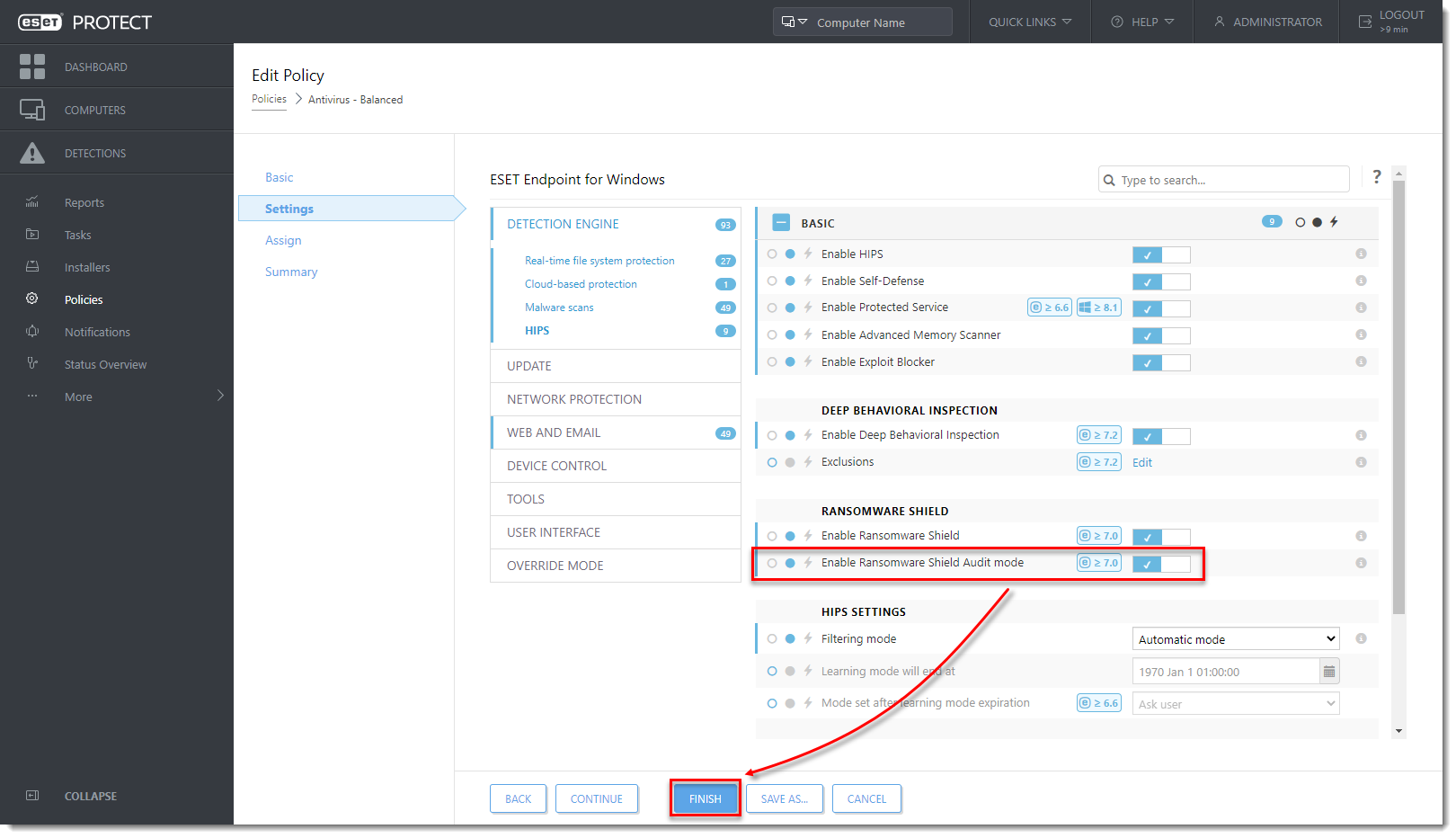 Click the toggle next to Enable Ransomware Shield Audit mode to enable this setting and click Finish to apply the Policy settings.