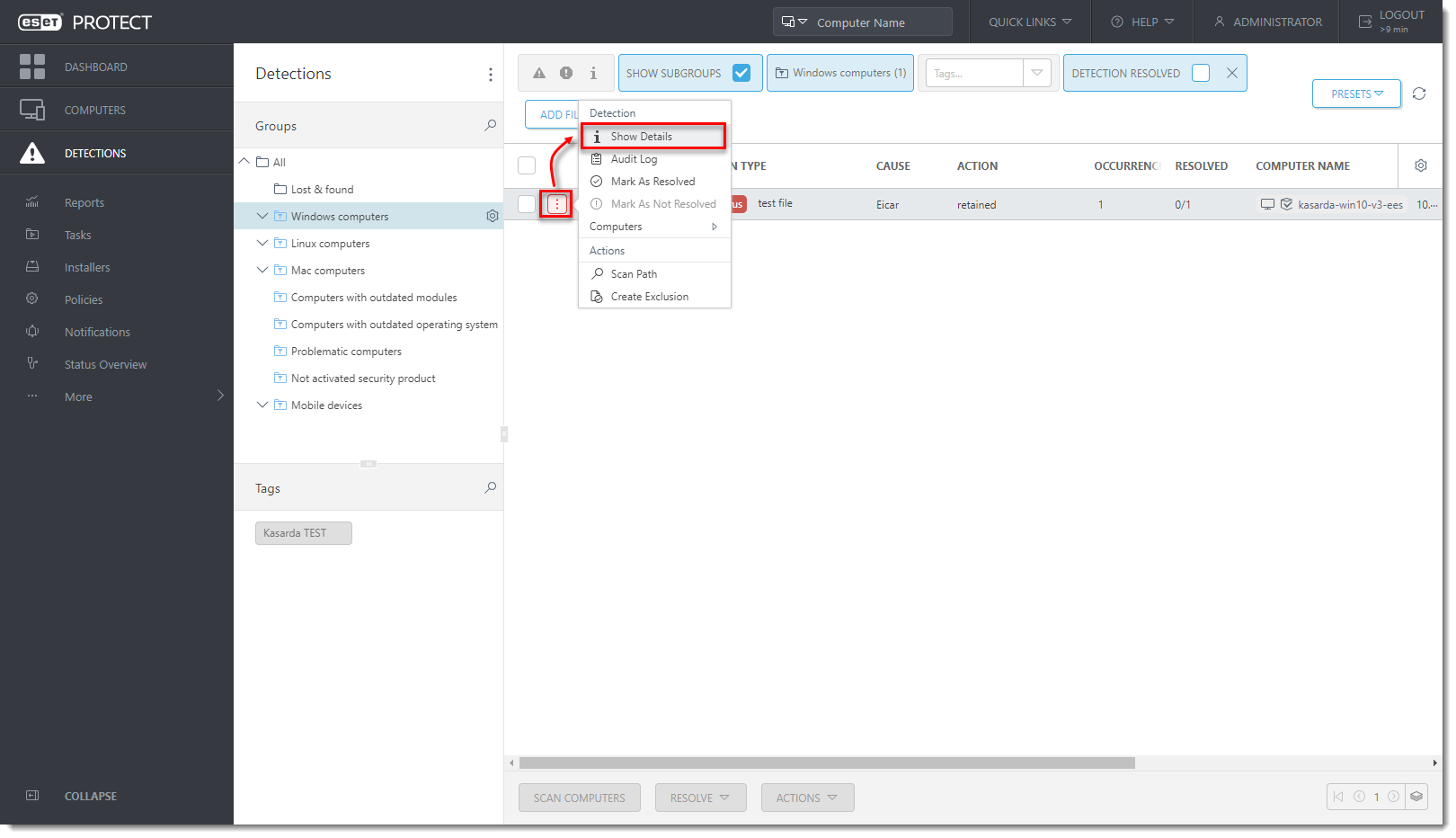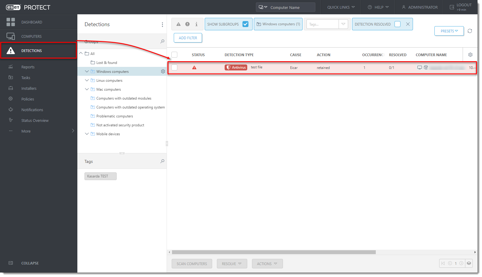 In ESET PROTECT or ESET PROTECT On-Prem Web Console click Detections. You can see the information about the potential ransomware application detected on the client computer.