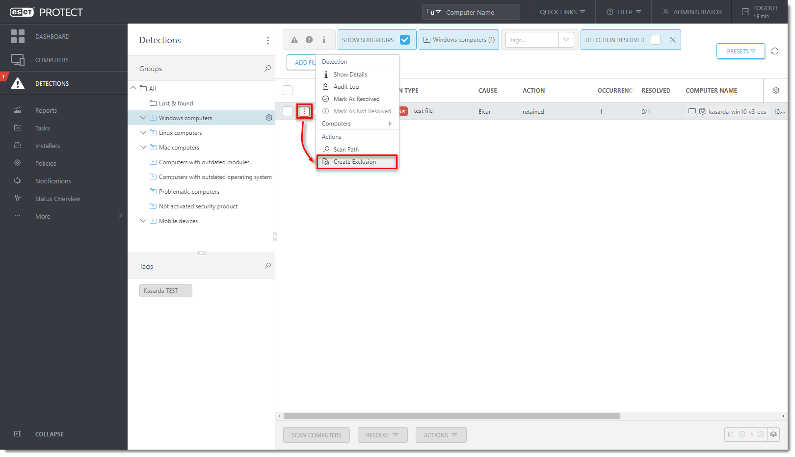 Click the detection and select Create Exclusion.