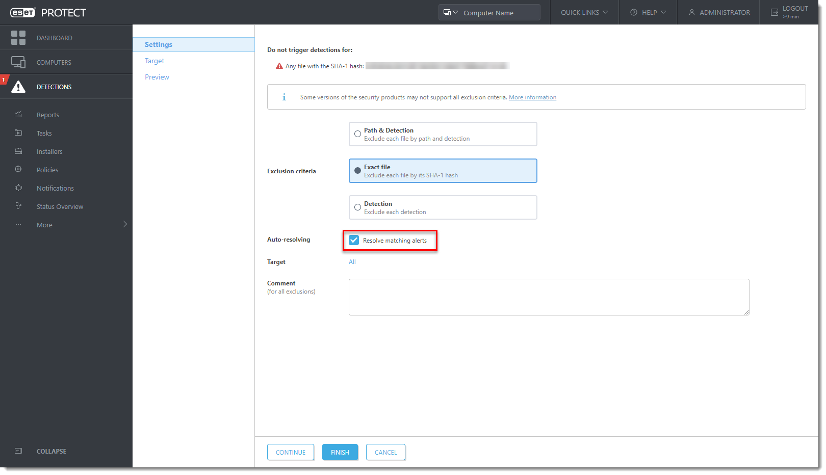 The Exclusion criteria is pre-selected based on the detection type. Select the check box Resolve matching alerts to automatically resolve the alerts covered by the exclusion. Optionally, you can add a Comment. Read more about creating exclusions in ESET Online Help.