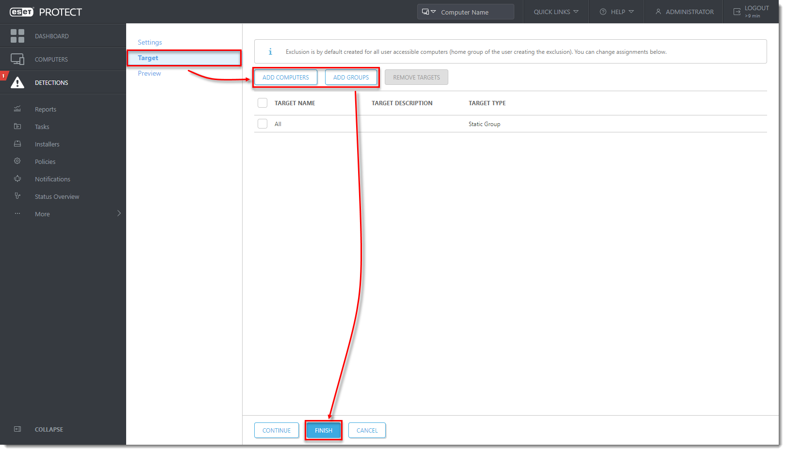 Click Target. Select computers or groups where the exclusion will be applied and click Finish.