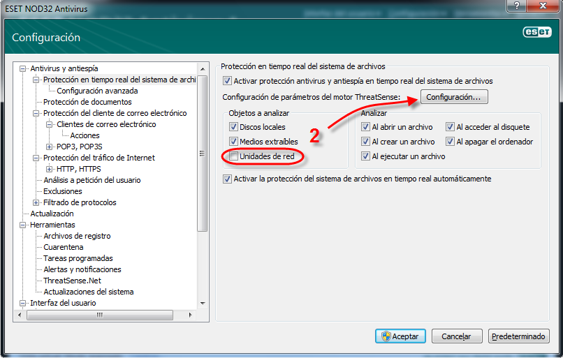 - Dentro del árbol de Configuración avanzada haga clic en Antivirus y antiespía → Protección en tiempo real del sistema de archivos y deseleccione el casillero de Unidades de red. Presione el botón en Configuración… próximo a la leyenda Configuración de parámetros del motor ThreatSense.