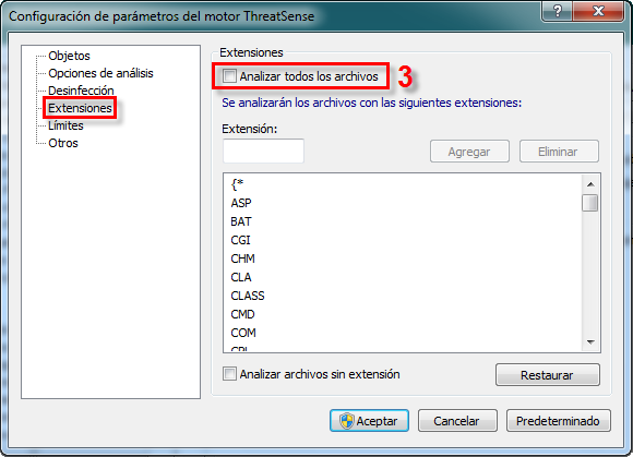 - Haga clic en Extensiones y deseleccione el casillero Analizar todos los archivos. Si este servidor utiliza Microsoft Exchange, seleccione EDB, TMP y EML en la lista de extensiones y luego haga clic en Eliminar.