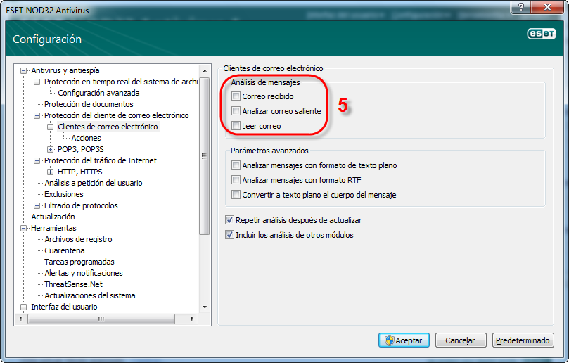 - Haga clic en Protección de correo → Clientes de Correo dentro del árbol de Configuración avanzada y deseleccione las opciones Correo recibido, Analizar correo saliente y Leer correo.