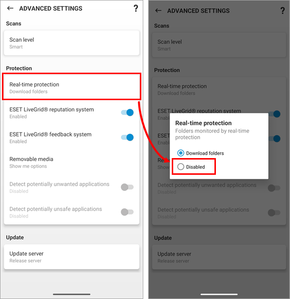 Pulse Protección en tiempo real y seleccione Desactivado para desactivar la protección en tiempo real.