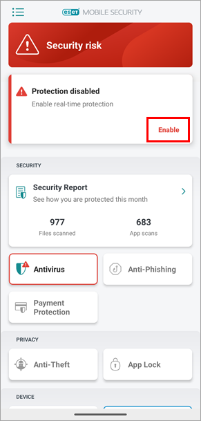 Restaure la protección en tiempo real lo antes posible. Toque Activar en la pantalla de inicio de ESET Mobile Security para Android.