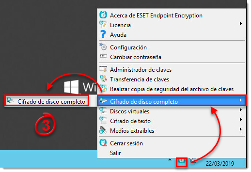- En el área de notificación de Windows, haga clic derecho sobre el ícono de EEE y seleccione Cifrado de disco completo → Cifrado de disco completo.