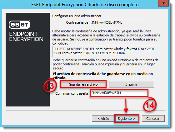 - La contraseña de administrador se mostrará. Es vital que se cree una copia de respaldo de esta contraseña, debido a que la necesitará para administrar o descifrar el sistema en el futuro. La contraseña de administrador puede también resultar de utilidadcomo inicio de sesión de emergencia, en caso de que una contraseña corriente se pierda. Para guardar una copia de la contraseña de administrador, haga clic en Guardar en archivo. Defina una ubicación de almacenamiento que no se encuentre en su sistema (por ejemplo, una unidad extraíble o de red).