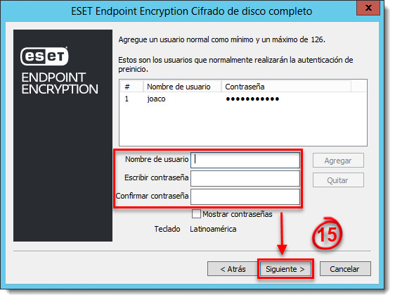 - Ingrese un nombre de usuario y contraseña y luego haga clic en Agregar. Esta información será requerida para iniciar el equipo en el futuro. Repita este paso para cada usuario necesario y luego haga clic en Siguiente.
