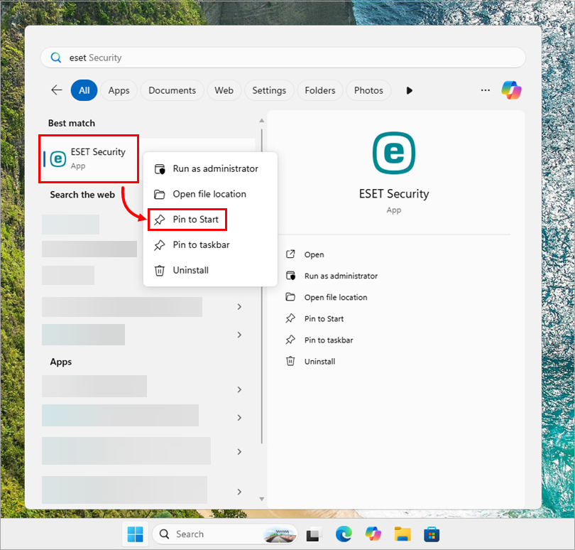 Haga clic con el botón derecho en su producto ESET y seleccione Anclar a Inicio en el menú contextual.