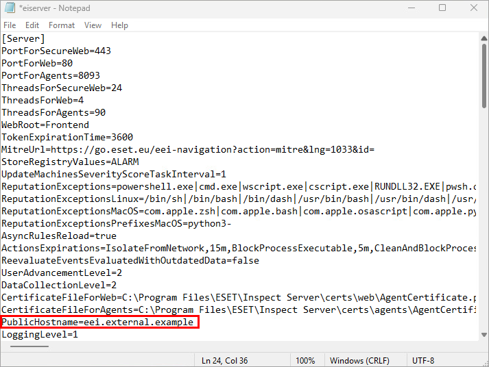 C:\Program Files\ESET\Inspect Server\ja avaaeiserver.ini-tiedostohaluamallasi tekstieditorilla. -