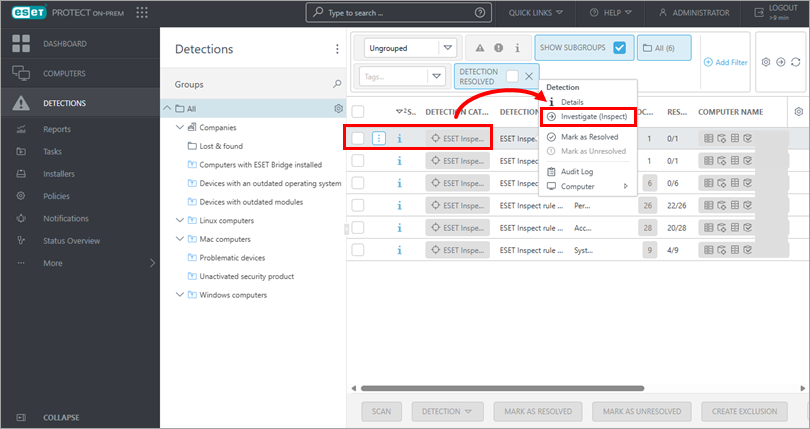 - ESET PROTECT On-Prem -ohjelmasta napsauttamalla Tutki (Inspect) ohjaa sinut palvelimen isäntänimeen julkisen isäntänimen sijasta