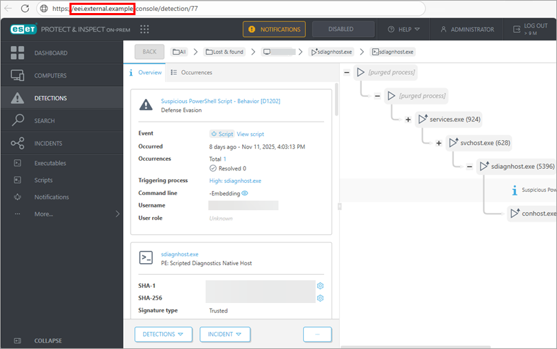 Jos ESET Inspect On-Prem -palvelimesi on yhdistetty ESET PROTECT On-Prem -palvelimeen, mutta sijaitsee ulkoisessa palvelimessa, tiedossa on ongelma, jossa Investigate (Tutki) (Tarkista) -painikkeen napsauttaminen ohjaa sinut palvelimen isäntänimeen julkisen isäntänimen sijasta.