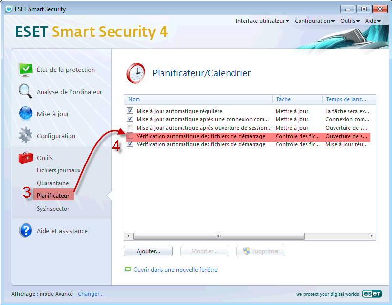 Par défaut, votre produit ESET analyse les programmes et la mémoire au démarrage. Si votre système prend plus de temps que d'habitude pour compléter l'analyse au démarrage, vous pouvez rencontrer un conflit entre programmes se lançant au démarrage. Vous ne pouvez pas annuler l'analyse de démarrage une fois lancée, cependant vous pouvez la désactiver temporairement pour les prochains démarrages en suivant les instructions ci-dessous: