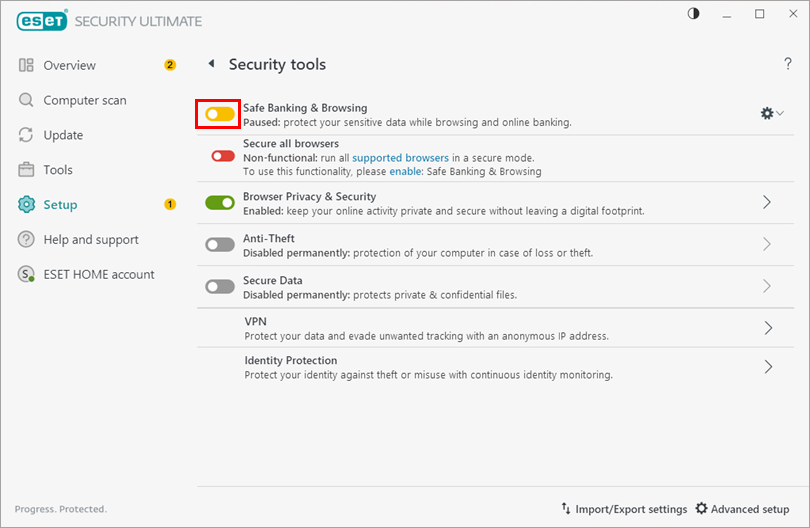 Cliquez sur la case à cocher située à côté de Safe Banking & Browsing pour réactiver la protection. La bascule devient verte lorsqu'elle est activée.
