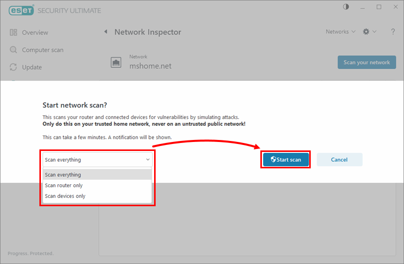 - Assurez-vous que votre home network est correctement identifié comme réseau domestique dans votre produit ESET. L'analyse ne s'achèvera pas si votre réseau domestique est identifié comme un réseau non fiable.