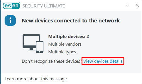 Si un nouvel ordinateur ou un nouveau périphérique se connecte à votre réseau, la notification ci-dessous s'affiche. Cliquez sur Afficher les détails du périphérique dans la fenêtre de notification ou cliquez sur Outils → Inspecteur réseau dans votre produit ESET pour afficher les périphériques actuellement connectés à votre réseau.