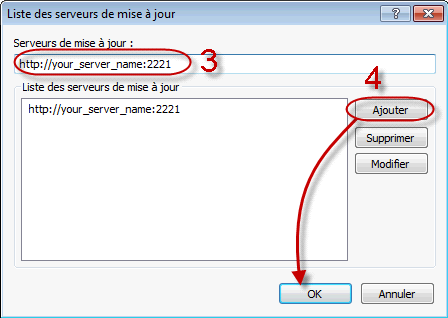 Pour ajouter votre serveur miroir comme serveur de mises à jour, entrez l'adresse IP sous le format suivant: http://your_server_name:2221 ou http://xxx.xxx.xxx.xxx:2221.
