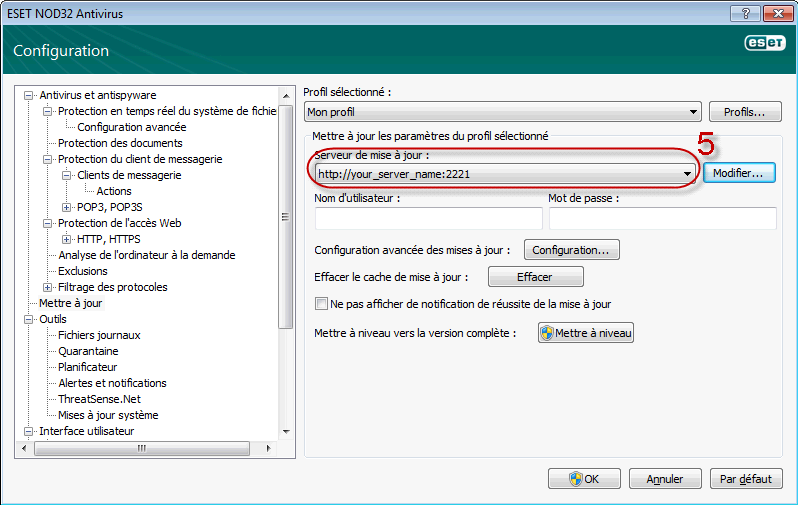 Après avoir créé votre serveur miroir, vous devez configurer les postes de travail pour qu'ils accèdent aux mises à jour. Il y a 2 méthodes pour configurer les postes clients: la première consiste à créer et pousser un fichier de configuration .xml depuis la console d'administration ESET vers les postes client (voir sections 3.2 et 5.1 du Guide de la Console d'Administration ESET pour de plus amples informations).