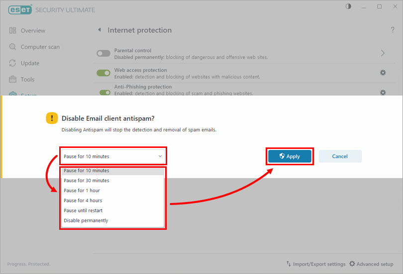 A legördülő menüből válassza ki azt az időtartamot, amelyre az Email kliens antispam funkció ki lesz kapcsolva, majd kattintson az Alkalmazás gombra. Az Email kliens antispam funkció mostantól le van tiltva. A maximális védelem biztosítása érdekében javasoljuk, hogy a lehető leghamarabb ismét engedélyezze.