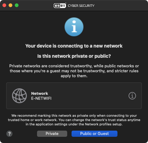 - After completing the installation of ESET Cyber Security, you are prompted to select whether your computer accesses a Public or Guest or Private network