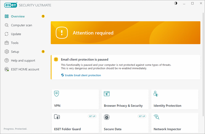 The yellow protection status indicates that your ESET product requires your attention. For example, the yellow icon indicates that Email client protection is paused, there is a problem updating the program (outdated modules, unable to update), or that your subscription is nearing its expiration date.