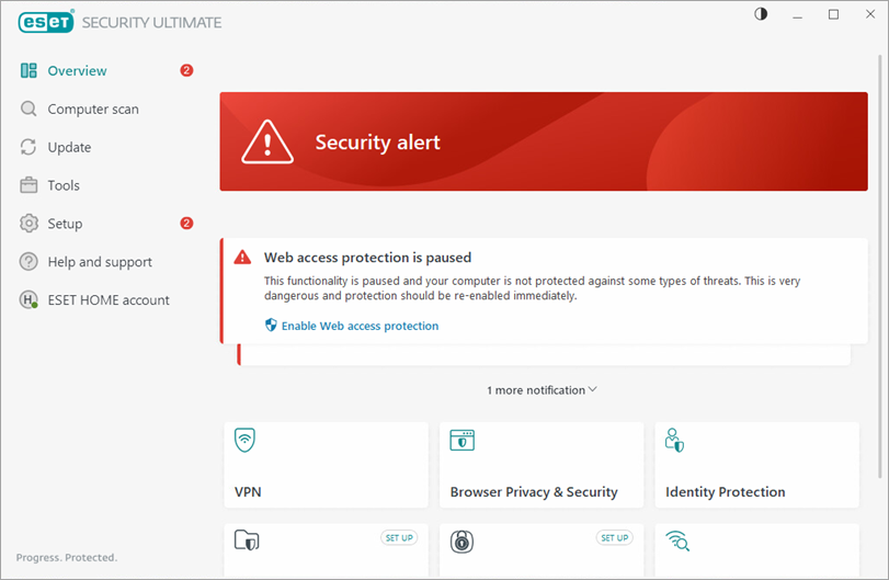- Your ESET product displays your current level of protection in the main program window