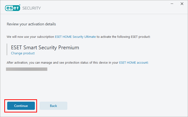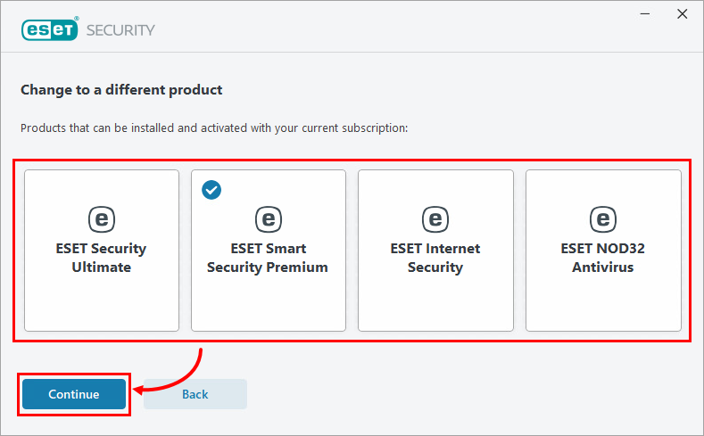 Select the product you want to change to (in this example, ESET Smart Security Premium is selected) and click Continue.