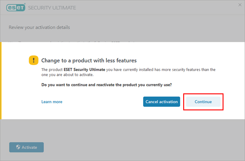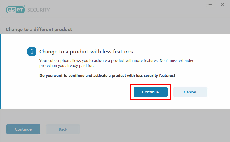 If you are changing to a product with fewer security features, read the message and click Continue.