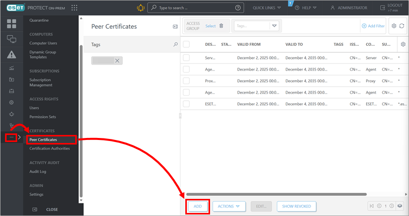 Open the Peer Certificates view: click More → Peer Certificates. Click Add.