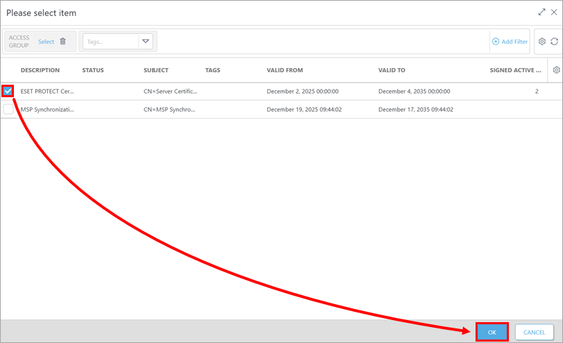 Select the certification authority that you want to use to sign the certificate. Click OK.