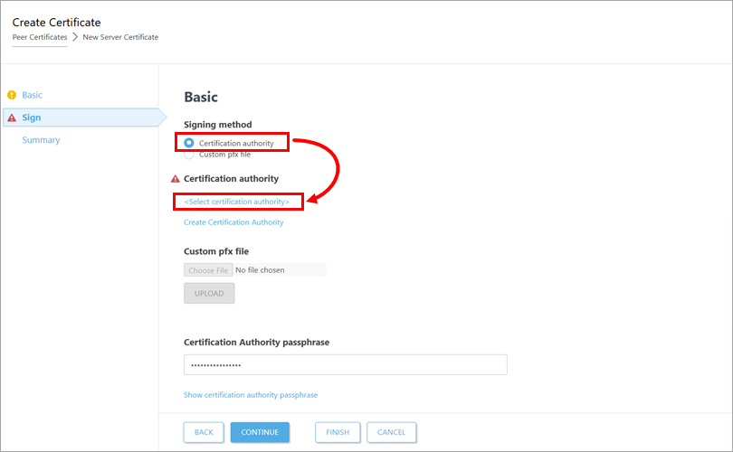 Under Sign. Below Signing method, select the radio button next to Certification authority. Below Certification authority, click Select certification authority.