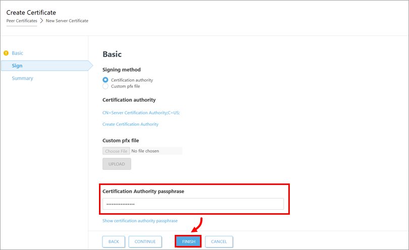 In the Certification Authority passphrase field, type the password you use to log in to the ESET PROTECT Virtual Appliance Web Console. Click Finish.