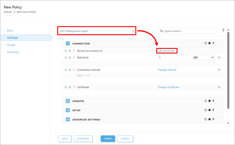 Under Settings, select ESET Management Agent from the drop-down menu and click Edit server list.