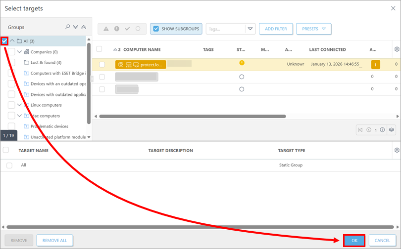The time to apply the policy will vary depending on your ESET PROTECT Server configuration. When the policy is applied, migrate the ESET PROTECT database to the target Windows server.