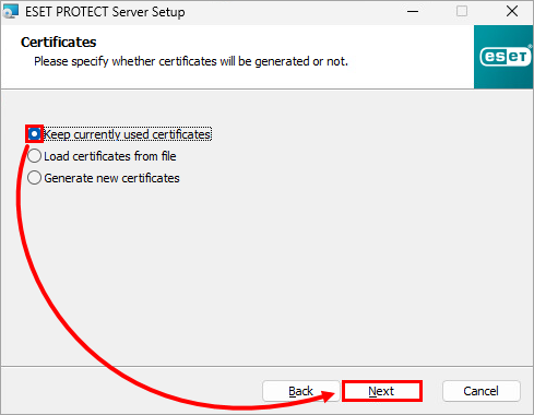 On the Certificates screen, select the radio button next to Keep currently used certificates and click Next.