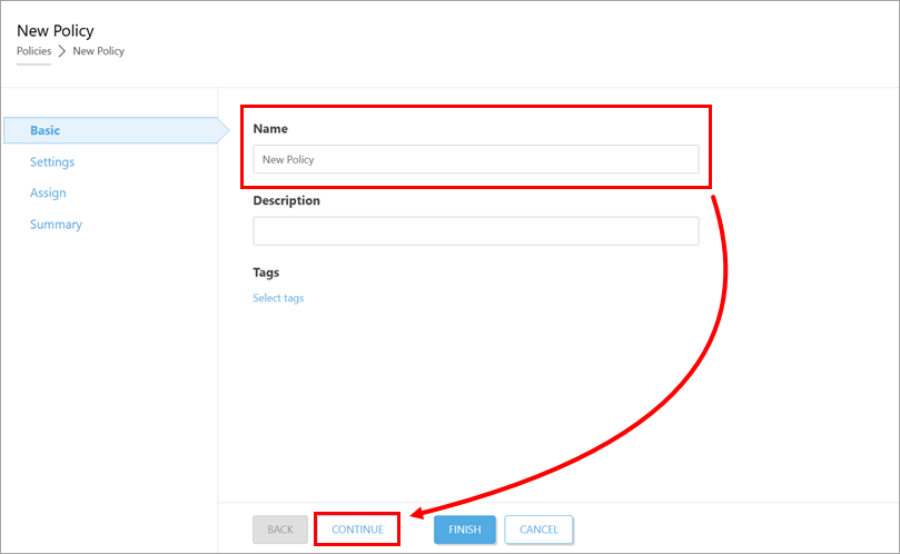 In the Name field, type a name for the policy and click Continue.