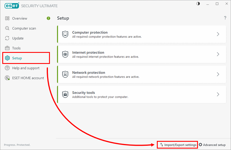 Open het hoofdvenster van uw ESET Windows product voor thuisgebruik of klein kantoor op de computer waar u de configuratie-instellingen wilt importeren.