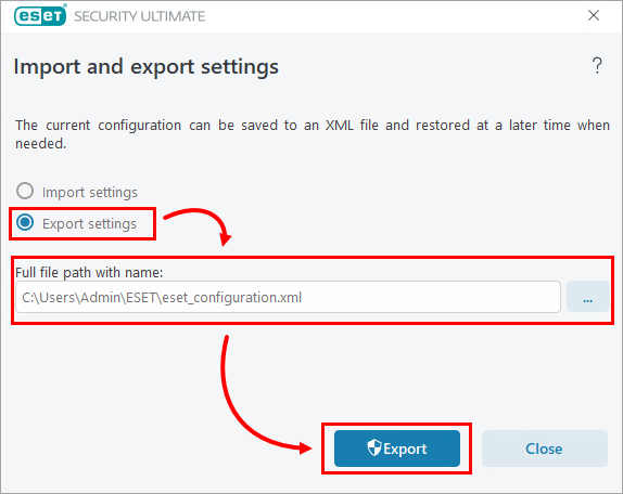 ESET Technical Support kan om een .xml-bestand met de configuratie-instellingen van uw ESET Windows product voor thuisgebruik of klein kantoor vragen om u beter te kunnen helpen. Exporteer de configuratie-instellingen van uw ESET product en voeg het geëxporteerde.xml bestand bij uw verzoek.