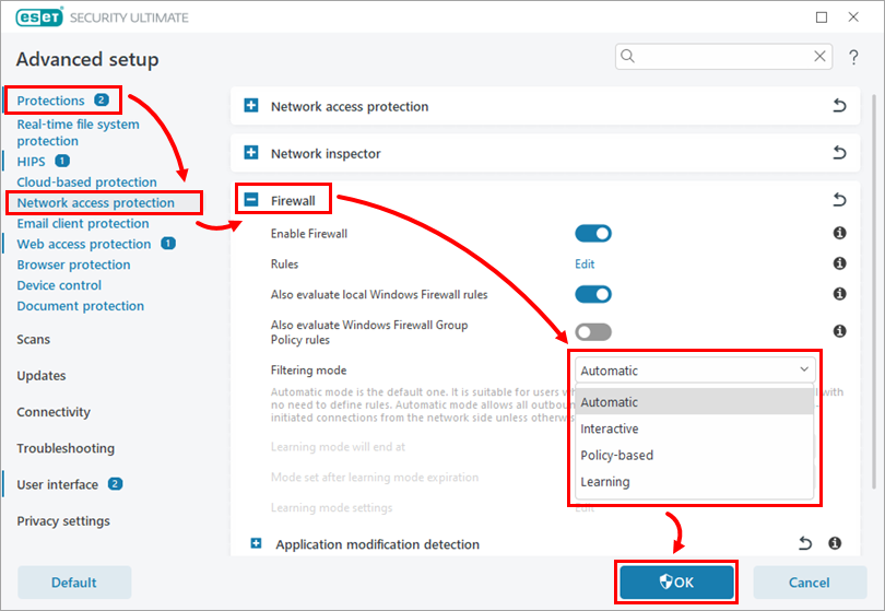 Click Protections → Network access protection. Expand Firewall. Select your desired filtering mode from the Filtering mode drop-down menu and click OK to save your changes. Continue to the next section for a summary of each filtering mode.   Figure 1-1