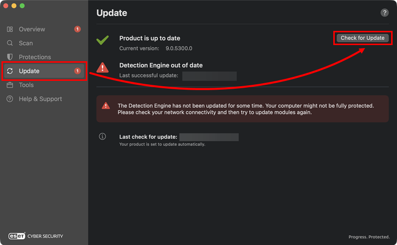 If the engine is not up to date, ESET Cyber Security will notify you about this in the Overview and Update screens. Click Update → Check for Update.
