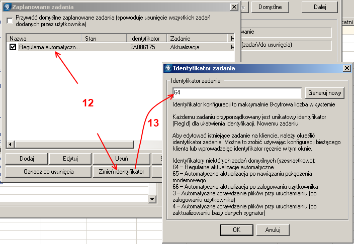 13. Wpisz 64 w pozycji Identyfikator zadania i kliknij OK ( identyfikator ‘64’ informuje oprogramowanie, że zaplanowane zadanie zostało stworzone jako Regularna automatyczna aktualizacja). Kliknij ponownie OK i zamknij okno Zaplanowane zadania.