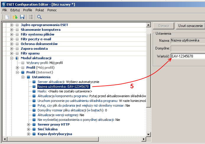5. Kliknij Nazwa użytkownika i wpisz swoją nazwę użytkownika ( otrzymaną po rejestracji programu) w polu Wartość.