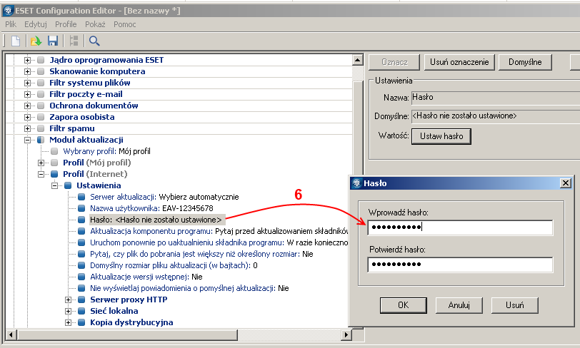 2. Rozwiń kategorię ESET Smart Security, ESET NOD32 Antivirus> Moduł aktualizacji. Kliknij prawym klawiszem myszy na Profil(Mój profil) i wybieramy z menu kontekstowego Nowy profil.