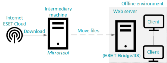 Set up the web server to serve the updates and installers to the machines in the offline environment. See the setup instructions for ESET Bridge and Microsoft IIS below.