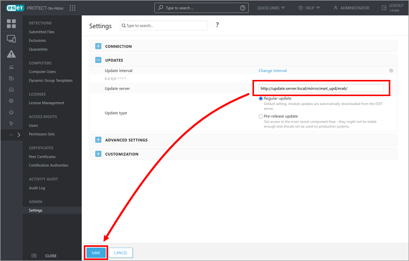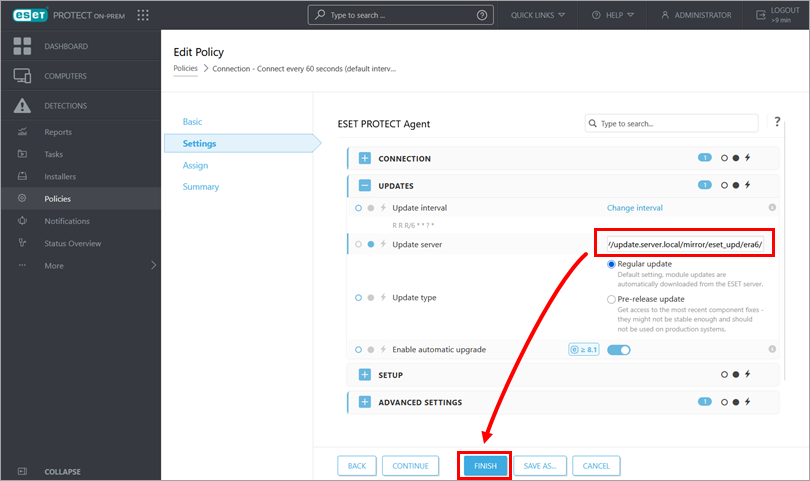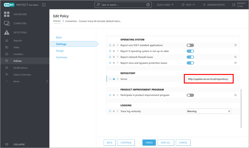 See the examples below to set paths of the Repository and Update servers with ESET Endpoint products. Do the following in ESET PROTECT On-Prem: