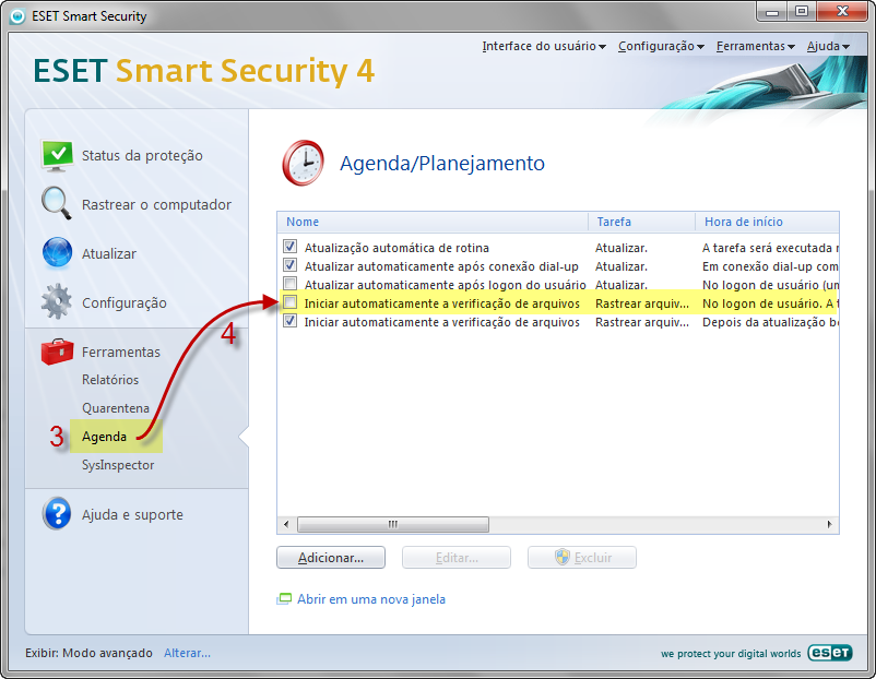 junto ao relógio do sistema ou clicando em Iniciar → Todos os Programas → ESET → ESET Smart Security ou ESET NOD32 Antivirus.
