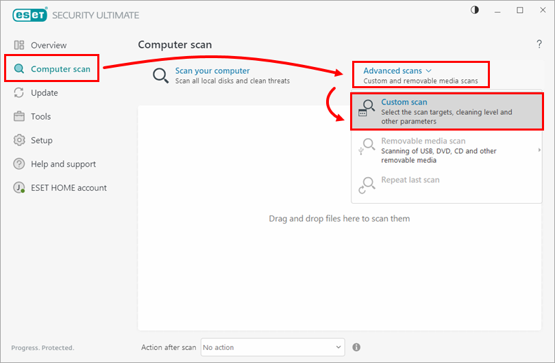 Click Computer scan→ Advanced scans, and select Custom scan from the drop-down menu.